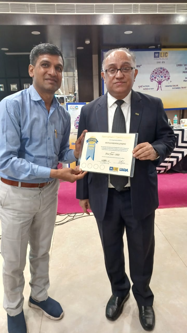 देवेश गाँधी एलआईसी के अंतरराष्ट्रीय स्तर के प्रमाण पत्र से सम्मानित